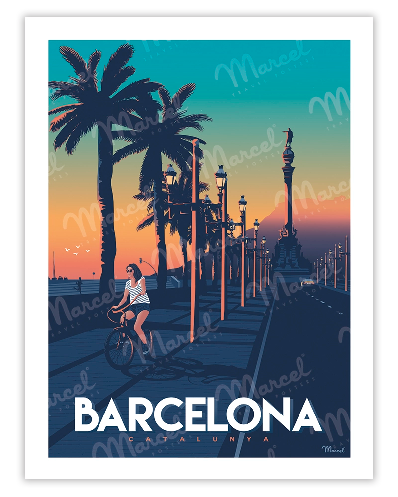 Long straight line, palm trees all along, statue of Columbus, Rambles, treat yourself to a Barcelona getaway, all in a retro style that will blend perfectly into your interior decoration.