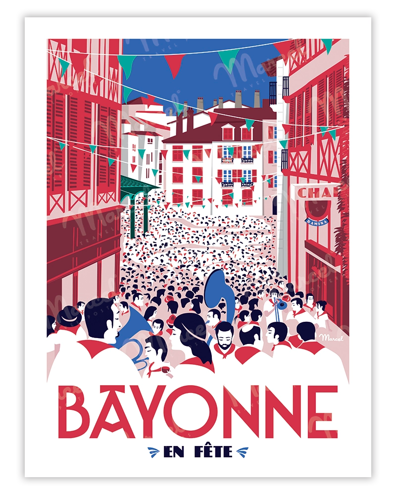 Traditional white and red colors, bandas in the street, festive atmosphere, escape to Bayonne, all in a retro style that will blend perfectly into your interior decoration.