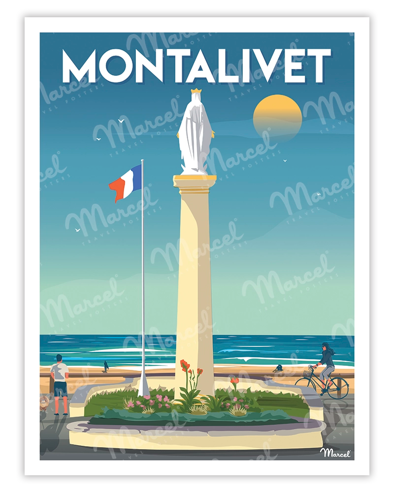 Rediscover the spirit of Montalivet , with its endless beaches, magnificent landscapes and serene atmosphere. This illustration, in a retro style, brings a touch of nostalgia while remaining resolutely modern, perfect for recalling memories of your vacation in the Médoc.