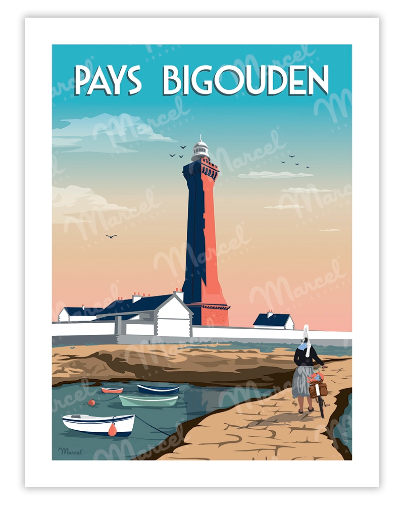 The PAYS BIGOUDEN poster is a vintage illustration of the sweet life of the French west coast. Everything is represented on this original poster: the traditional Bigouden headdress and costume of course; the bike ride on the promontories such as the Pointe de la Torche, or the harbor of Brest; the charming little port of Bénodet and its fishing boats; not forgetting Belle-Île, the aptly named which reveals its whitewashed houses. Concerned about making you benefit from the quality of our posters, we carefully package them in their protective tools so that they are delivered to you in an optimal way.