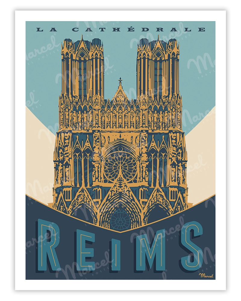 Coronations of the kings of France, baptism of Clovis, Gothic art, discover the Notre-Dame de Reims cathedral, a historic monument and emblematic of the history of France, all in a retro style that will blend perfectly into your interior decoration.