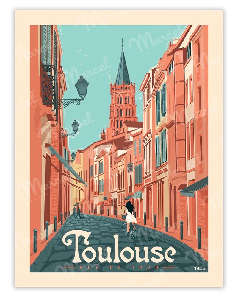 Pretty cobbled street, bell tower of the Saint-Sernin church in the distance, typical pink bricks, discover this emblematic street of the Arnaud-Bernard district, all in a retro style that will blend perfectly into your interior decoration.