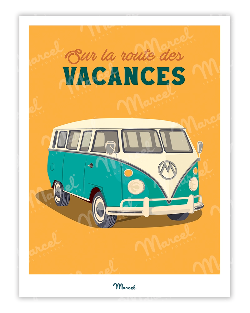 The Travel Color poster "On the Road to Vacation in a Van" is ideal for enhancing your living room, bedroom, or any other space evoking vacation. If you love the relaxed atmosphere of the South of France and the spirit of road trips in a vintage car, this illustration will bring a warm and freeing touch to your interior.