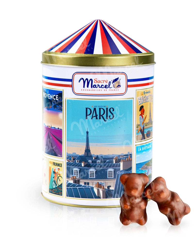 An essential symbol of the Parisian landscape, the Morris Column takes on a new dimension thanks to Sacré Marcel. With this elegant metal box, decorated with illustrated retro posters, we revisit this pillar of French urban art to create a truly gourmet souvenir to collect. More than just an object, this creation embodies a poetic and gourmet vision of the capital.