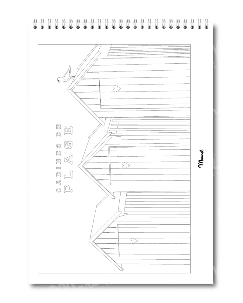 Reliure spirale métallique blanche, papier offset 190gr et prédécoupe de la page pour chaque dessin