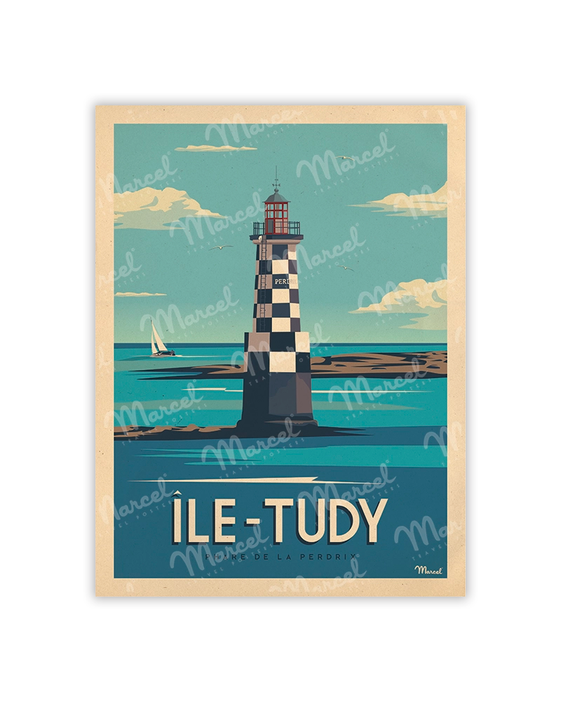 Original Illustration Postcard ÎLE-TUDY “Perdrix Lighthouse”