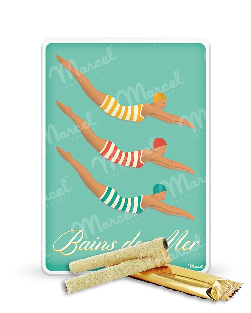 Between seaside illustrations, gourmet pastries, and summer evocations, the “Bains de Mer” box is the perfect gift for those nostalgic for vacations, vintage design enthusiasts, or gourmets looking for a chic and sunny souvenir. A perfect gift to extend summer… all year long.