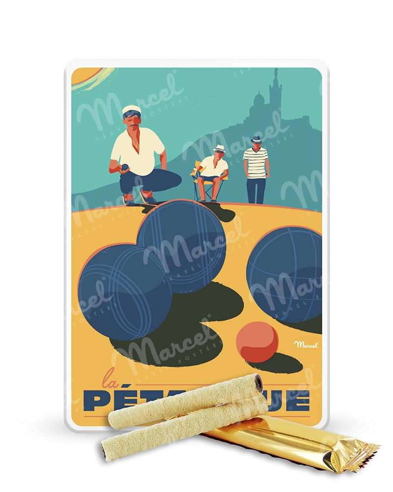 The box features the visual of the original "La Pétanque" poster, a scene full of sunshine and good humor, inspired by Marseille. It features all the cult elements: steel balls, a jack, friends gathered, and in the background, the shadow of the Notre-Dame de la Garde basilica, protector of the Phocaean city. All illustrated in a vintage and colorful style, which evokes vacations, cool afternoons, and the unique beauty of the Mediterranean Coast.