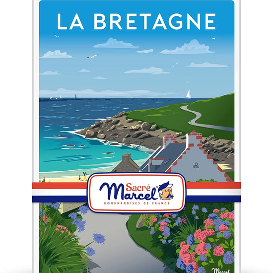 Avec la boîte métal "Côte Bretonne", Sacré Marcel vous invite à une escapade sur les falaises bretonnes, là où les rochers battus par les vagues rencontrent le vent du large. Cette création illustrée au style rétro élégant capture toute la force sauvage et poétique du littoral breton, pour offrir un souvenir gourmand de bord de mer, aussi visuel que gustatif.