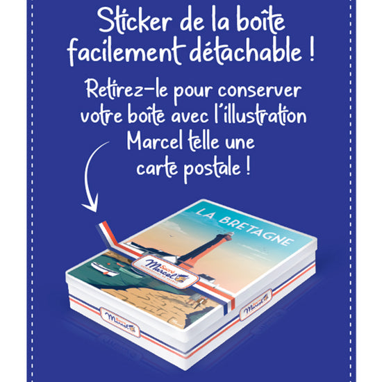 La boîte reprend le visuel de l’affiche originale "Pays Bigouden", une illustration vintage pleine de charme. On y retrouve tout l’esprit de la Bretagne authentique : la fameuse coiffe Bigoudène, les costumes traditionnels, les balades à vélo sur des promontoires comme la pointe de la Torche ou la rade de Brest, sans oublier le port de Bénodet et ses barques colorées. La douceur de vivre de la côte ouest est sublimée dans un style graphique rétro révélant tous les détails subtils de cette région emblématique.