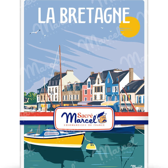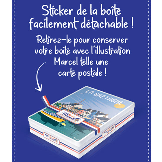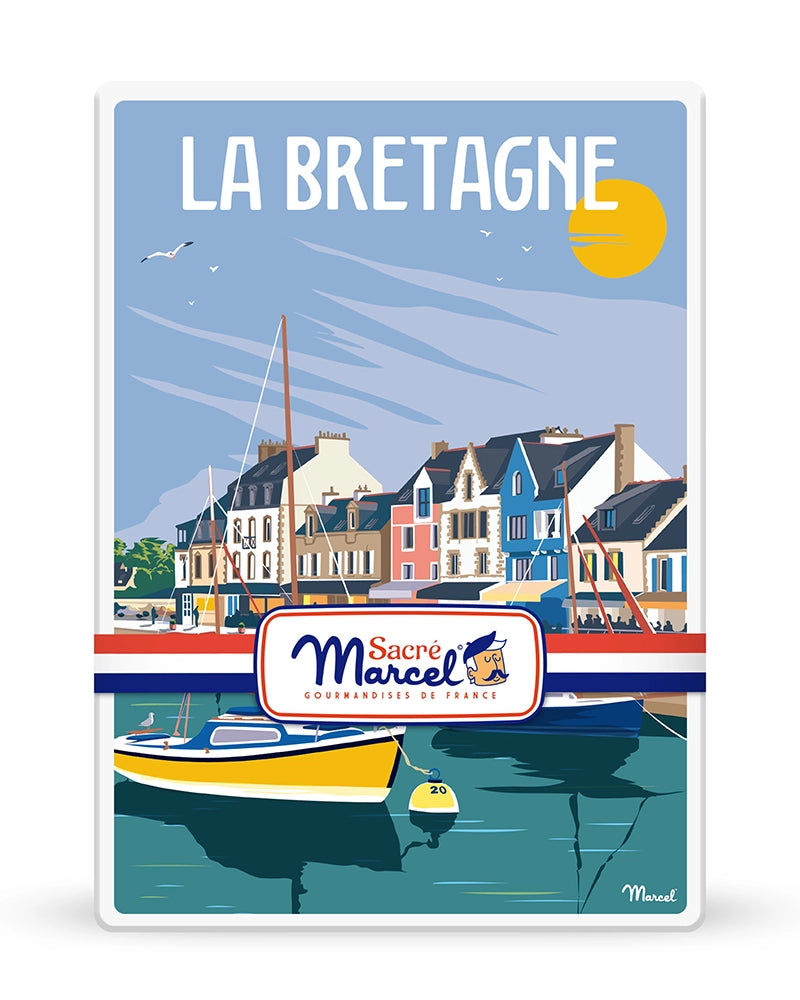 Cette boîte reprend l’univers graphique de l’affiche originale LA TRINITÉ-SUR-MER, une station balnéaire bretonne emblématique située dans la baie de Quiberon. Dans un style rétro plein de charme, Marcel vous invite à flâner le long du port de plaisance, à admirer les voiliers élégants, et à découvrir les régates célèbres de ce village marin typique. L’ambiance paisible et authentique de La Trinité-sur-Mer s’invite dans votre intérieur comme dans votre assiette.