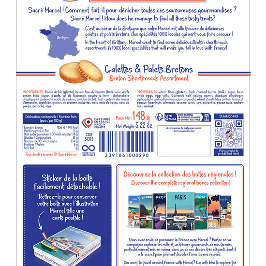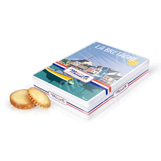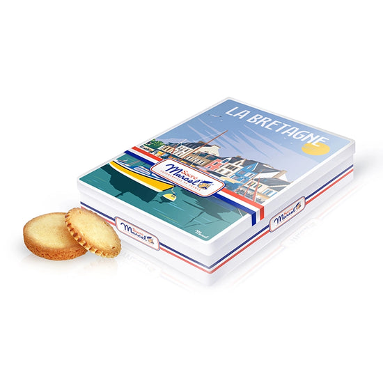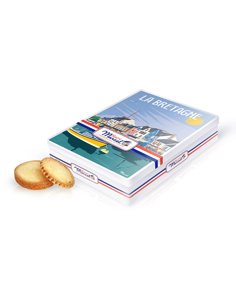 À l’intérieur, vous trouverez de délicieuses galettes bretonnes pur beurre, au goût fondant et légèrement salé, qui évoquent immédiatement le terroir breton. Confectionnées selon la tradition pâtissière régionale, ces biscuits gourmands sont idéals pour accompagner un thé, un café ou une pause au coin du feu, en pensant aux vacances en bord de mer.