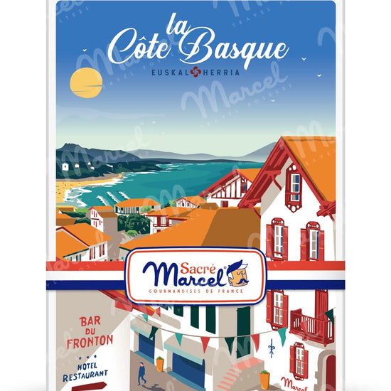 L’illustration qui orne cette boîte reprend l’univers graphique de l’affiche BIDART "Côte Basque", créée par Marcel dans un style rétro coloré. Le dessin vous plonge au cœur de ce village basque authentique, perché entre Biarritz et Guéthary, autrefois port de pêche à la baleine, aujourd’hui spot emblématique de surf et de détente balnéaire. On y devine les falaises spectaculaires, les maisons traditionnelles à colombages et l’ambiance typique d’un café sur la place Atchoarena.