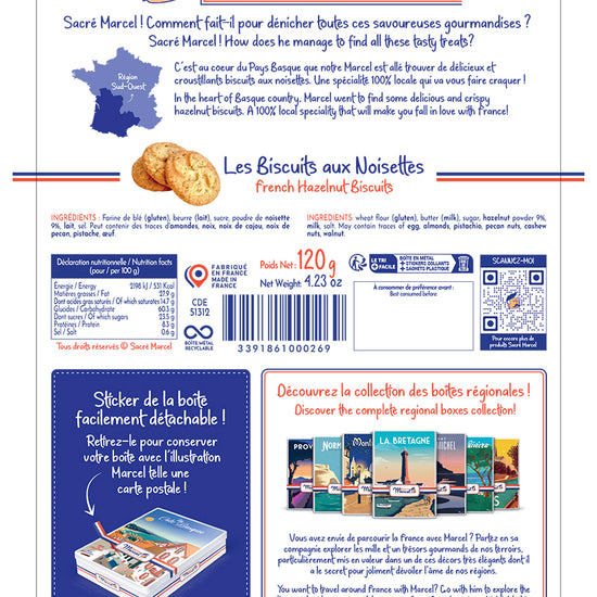 À l’intérieur de cette boîte à offrir élégamment illustrée, vous trouverez de délicieux biscuits aux noisettes, à la texture sablée et au goût franc, à l’image du Pays Basque. Généreux, parfumés, légèrement torréfiés, ils évoquent la tradition culinaire du terroir, entre montagne et océan. Parfaits pour une pause goûter ou un moment de partage.