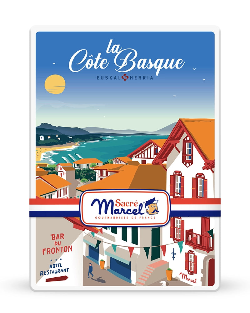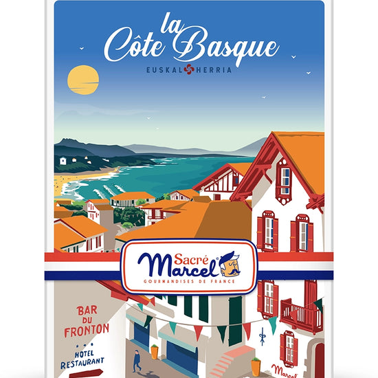Avec la boîte métal "La Côte Basque", Sacré Marcel vous emmène entre falaises escarpées, plages de surf et villages typiques du Sud-Ouest. Inspirée par l’esprit vibrant de la côte Atlantique, cette boîte illustrée aux couleurs de l’océan et des maisons à colombages rouges incarne la force et la douceur de cette région singulière. Un souvenir gourmand aussi visuel que gustatif, à offrir ou à collectionner.