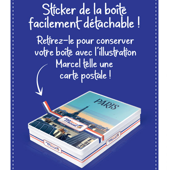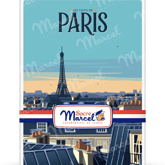 Ce décor emblématique, classé au patrimoine architectural, représente à lui seul l’essence de l’élégance urbaine du XIXe siècle. On y aperçoit des cheminées en argile, des lucarnes et des lignes géométriques caractéristiques, dessinées avec minutie dans un style rétro-chic fidèle à l’univers Marcel. Véritable clin d’œil artistique à la carte postale d’autrefois, cette boîte s’intègre parfaitement dans une décoration d’intérieur raffinée.
