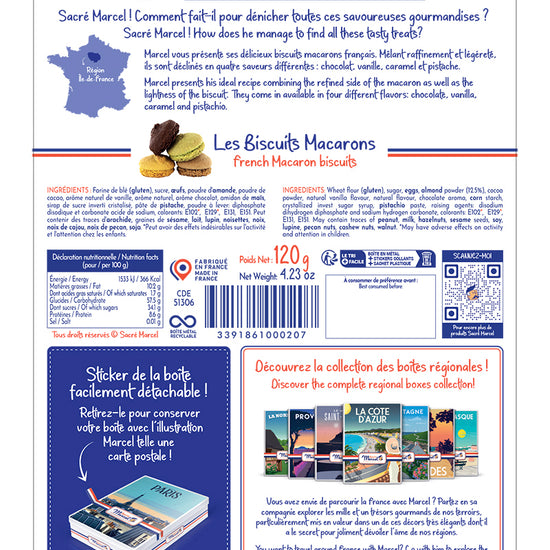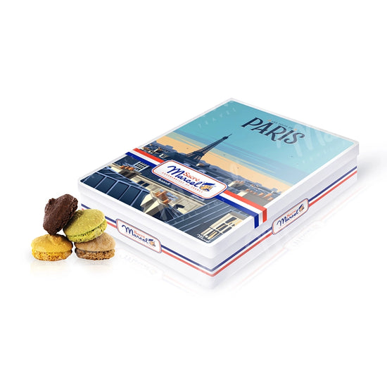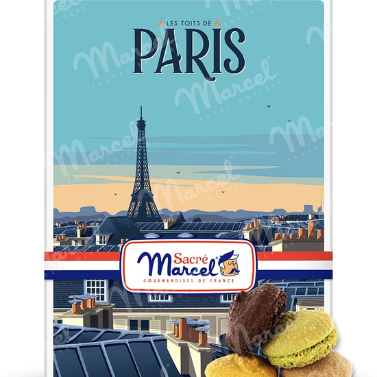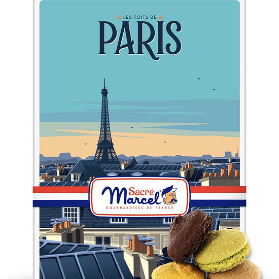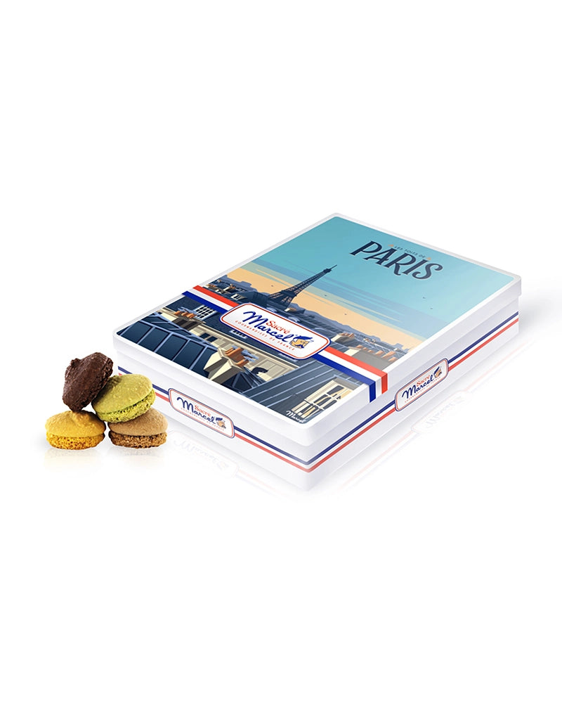 À l’intérieur, découvrez un assortiment de délicieux biscuits macarons aux coques craquantes et aux saveurs gourmandes, symboles de la pâtisserie française. Chaque bouchée vous rappellera les promenades sur les toits, les couchers de soleil parisiens, et l’art de vivre à la française. Cette boîte est un hommage gustatif et visuel à Paris, idéale comme cadeau ou comme souvenir de France à conserver précieusement. Un must-have pour les amoureux de la ville lumière, de son art et de sa douceur sucrée.