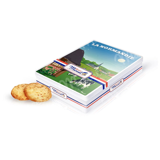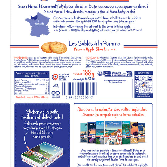 À l’intérieur, découvrez de délicieux sablés à la pomme, réalisés dans la pure tradition artisanale. Croquants, légèrement beurrés et subtilement fruités, ils évoquent les vergers en fleurs du printemps normand, les marchés de producteurs locaux et les goûters à la campagne. Une gourmandise typique, à déguster en toute simplicité, seul ou en bonne compagnie.