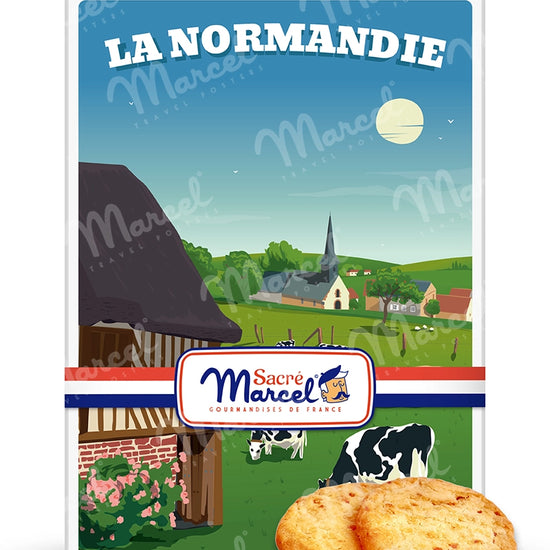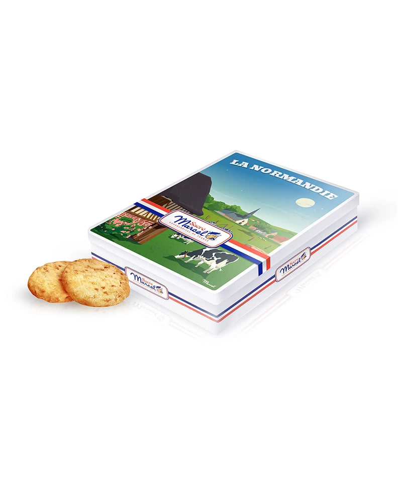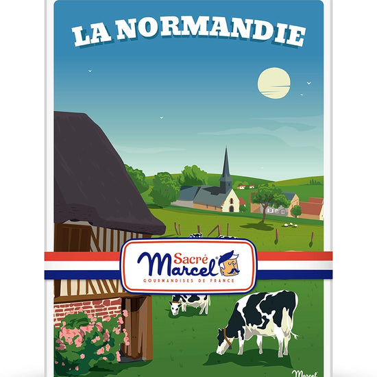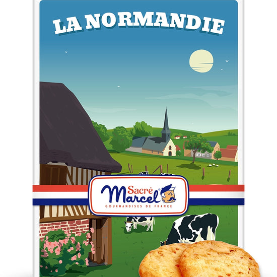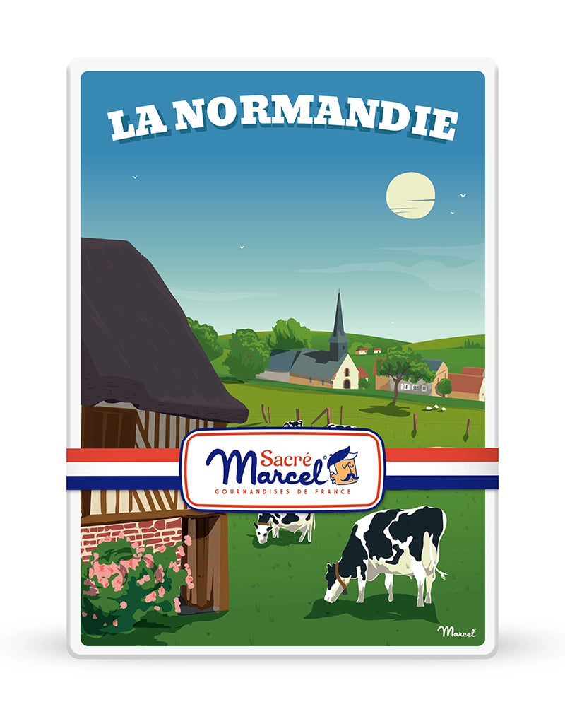 Avec la boîte métal "Campagne Normande", Sacré Marcel vous transporte dans un décor bucolique fait de chaumières pittoresques, de prairies verdoyantes et de vaches normandes. Cette boîte illustrée capture toute la sérénité de la Normandie rurale, et devient un souvenir gourmand plein de charme et d’authenticité.