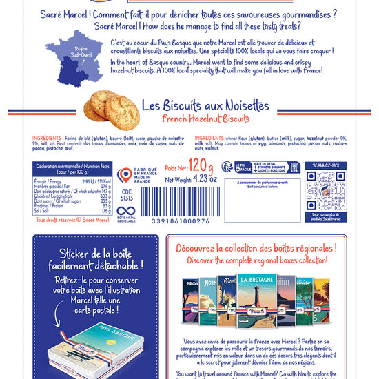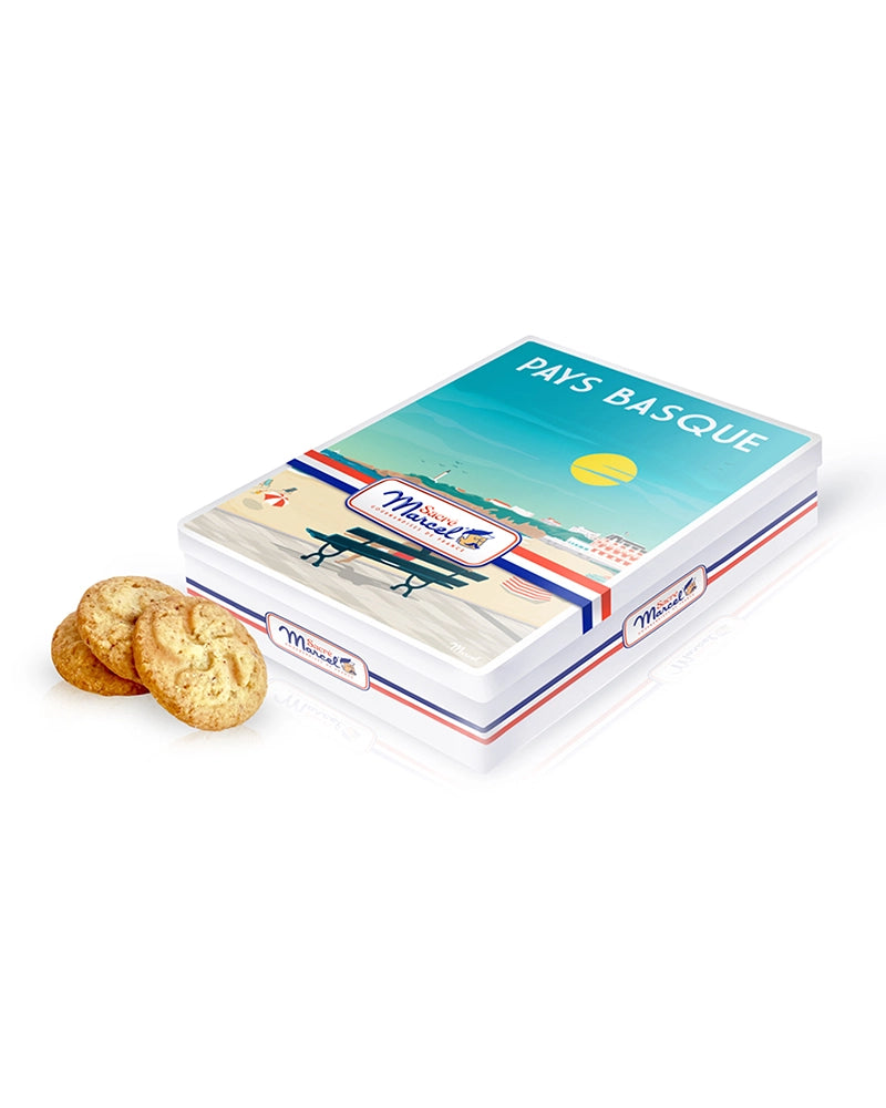À l’intérieur de cette boîte au charme rétro, découvrez de délicieux biscuits aux noisettes, confectionnés dans le respect des recettes traditionnelles basques. Leur texture croquante, leur goût franc et leur parfum délicatement grillé en font le compagnon idéal des pauses sucrées, entre mer et montagne. Un souvenir gourmand authentique, à savourer sans modération.