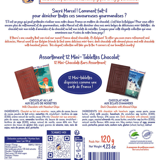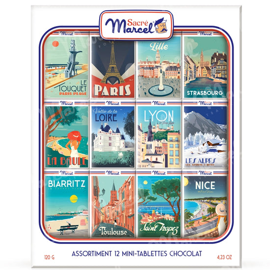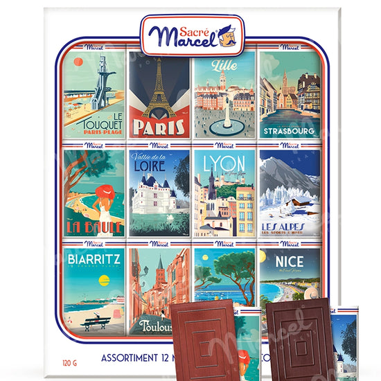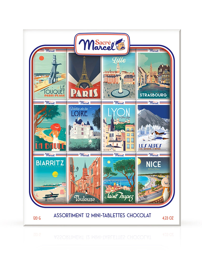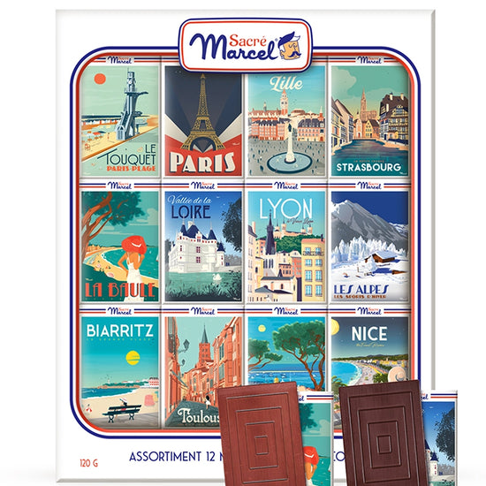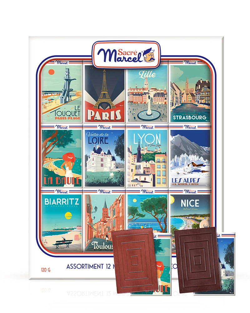 Offrez-vous un voyage sucré à travers la France avec cet étui illustré unique, qui reconstitue la carte de l’Hexagone à travers des mini-tablettes de chocolat artisanal. Chaque tablette est décorée d’une illustration régionale originale signée Marcel, mettant à l’honneur des destinations emblématiques comme Le Touquet Paris-Plage, Paris, Lille, Strasbourg, La Baule, la Vallée de la Loire, Lyon, les Alpes, Biarritz, Toulouse, Saint-Tropez, et Nice. Un souvenir gourmand et pédagogique à offrir ou à s’offrir, pour petits et grands curieux de terroirs.