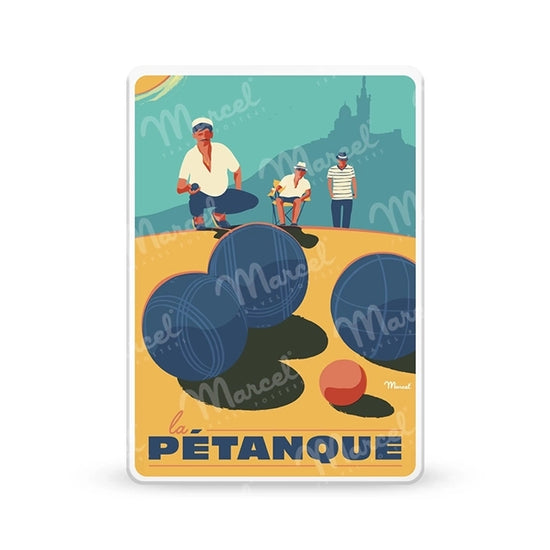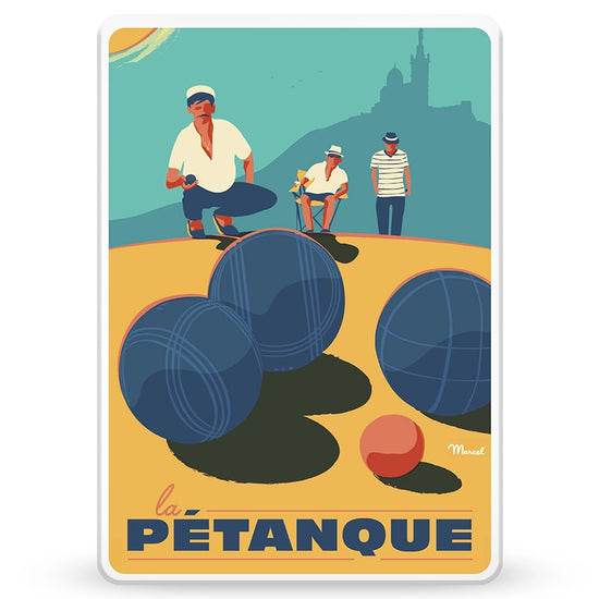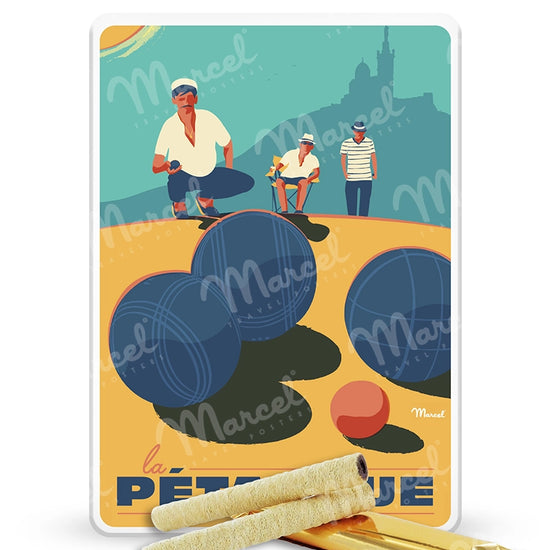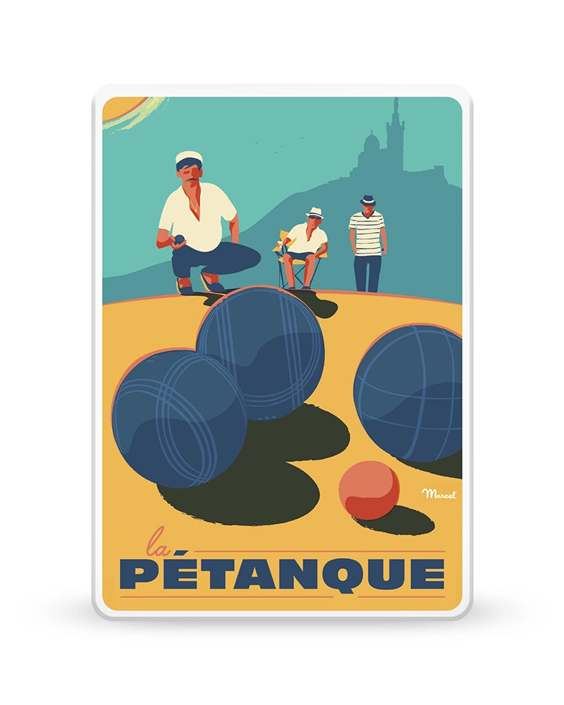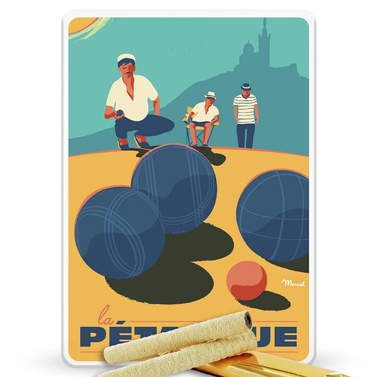 La boîte reprend le visuel de l’affiche originale "La Pétanque", une scène pleine de soleil et de bonne humeur, inspirée de Marseille. On y retrouve tous les éléments cultes : boules en acier, cochonnet, amis réunis, et en toile de fond, l’ombre de la basilique Notre-Dame de la Garde, protectrice de la cité phocéenne. Le tout illustré dans un style vintage et coloré, qui évoque les vacances, les après-midis à la fraîche, et la beauté unique de la Côte Méditerranéenne.