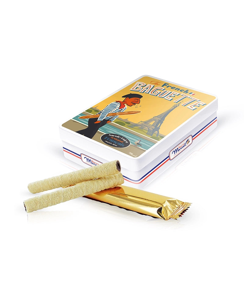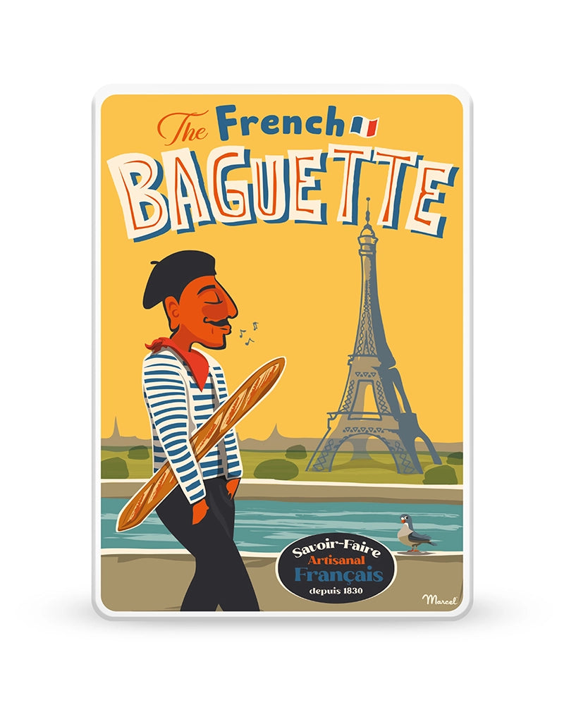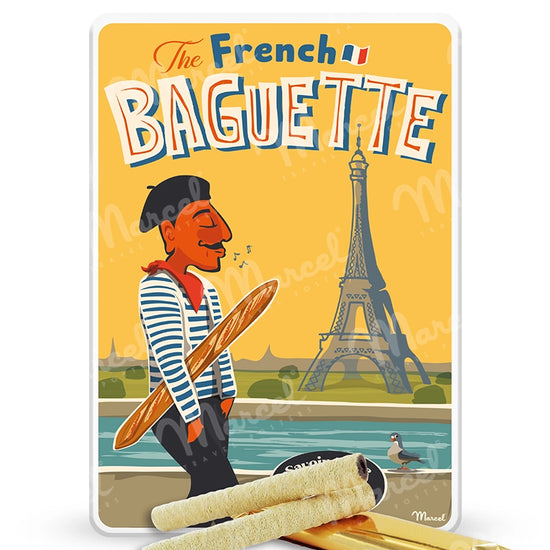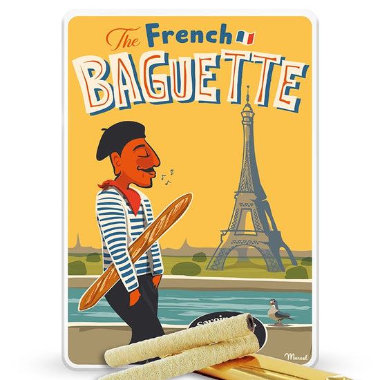 La boîte s’inspire directement de l’affiche originale "The French Baguette", dans un style rétro empreint d’humour et de tendresse. Marcel y célèbre cette icône de la gastronomie française inscrite au patrimoine culturel immatériel de l’UNESCO. Avec plus de 30 millions de ventes chaque jour en France, la baguette rythme les repas des Français : beurrée au petit déjeuner, trempée dans le café, ou accompagnée de fromages à l’apéro.